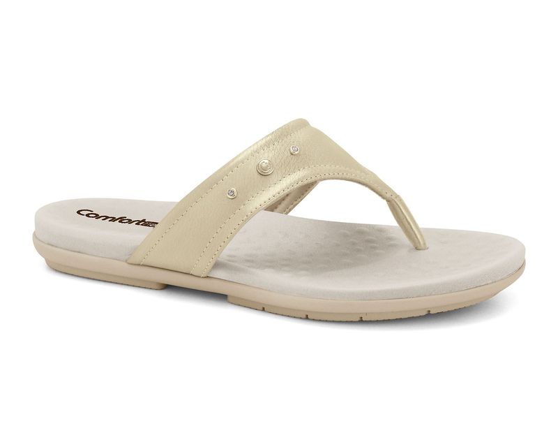 Confeccionado em material sintético, o Chinelo Feminino Dourado Comfortflex oferece durabilidade e um visual sofisticado. Seu design com salto baixo de 1 cm proporciona uma elevação discreta, garantindo conforto durante todo o dia. Ideal para ocasiões casuais e no dia a dia, o chinelo possui um bico arredondado que proporciona um ajuste confortável e elegante.